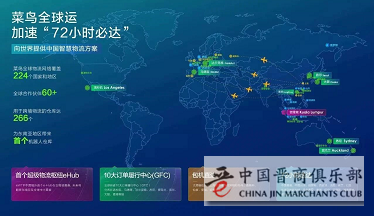有消息称,菜鸟已经在33个国家构建了供应链网络,并在中国杭州、香港、马来西亚、比利时、泰国、印尼、越南等地部署世界性的枢纽。希望通过区别于传统集装箱运输的方式,以达到“全球72小时达”的目标。