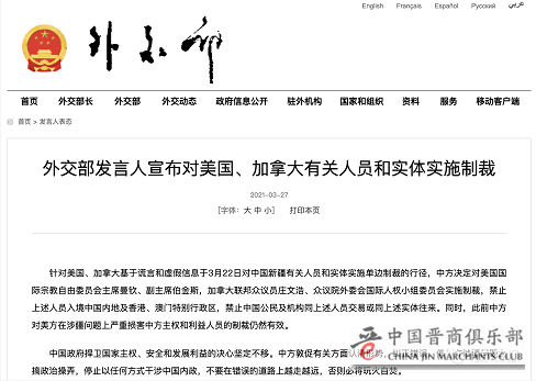 3月27日晚,外交部发言人宣布对美国、加拿大有关人员和实体实施制裁: