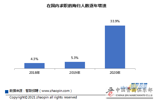 2020年,向国内岗位投递简历、即有意在国内发展的海归人才数量较2019年猛增33.9%,增幅远高于2019年(5.3%)、2018年(4.3%)的同比增幅。说明在近年来海归回国发展意愿持续增强的大趋势下,2020年疫情黑天鹅事件及国际关系变化等因素明显起到助推作用,加速海归回国潮流。