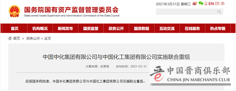 紧接着,中化集团也在官网发布了联合重组的消息,称两家公司实施联合重组,新设由国务院国有资产监督管理委员会代表国务院履行出资人职责的新公司,中化集团和中国化工整体划入新公司。