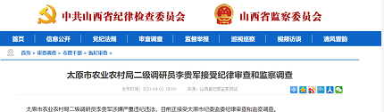太原市农业农村局二级调研员李贵军涉嫌严重违纪违法,目前正接受太原市纪委监委纪律审查和监察调查。