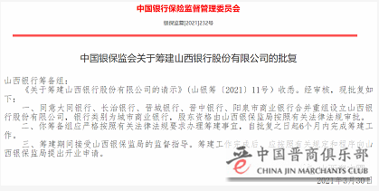 《批复》称,同意大同银行、长治银行、晋城银行、晋中银行、阳泉市商业银行合并重组设立山西银行股份有限公司,银行类别为城市商业银行,股东资格由山西银保监局按照有关法律法规审批。