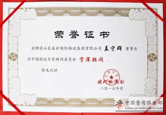 盖世集团当选为《现代物流报》2015年度全国理事会常务理事单位,董事长盖守群、总经理盖忠琳被聘为中国物流专家顾问委员会资深顾问。