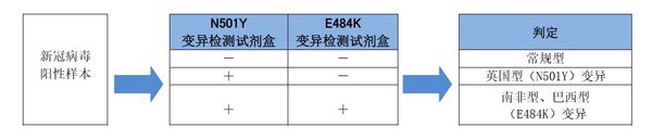 富士胶片和光纯药开发的新冠病毒变异检测试剂盒对变异病毒的判定示意图(+表示判定为阳性、-表示判定为阴性)