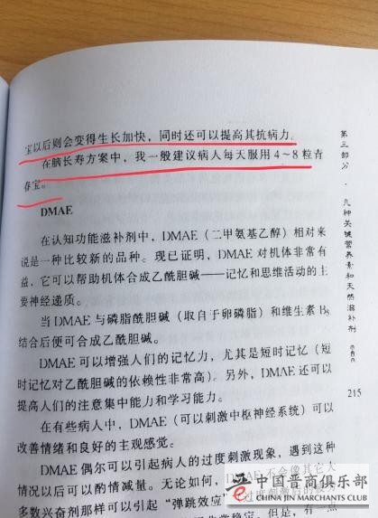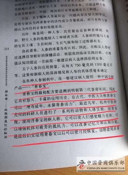 企业负责人还向笔者展示了一本名为《脑长寿》的美国现代医学著作,更是让我深深为正大青春宝口服液的影响力之大而惊叹。该书第214页中明确写着:“在各种人参制剂中,我一般建议病人使用一种国家专利产品——青春宝。”可见其在医学界的权威性。