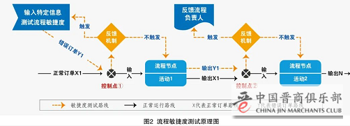 第一种正常流程测试法,输入订单X1通过“控制点①”,正常的订单信息应顺利通过,接着通过“活动1”输出“成果X1”依次走完全流程,正常的订单信息在整个流程不会触发异常反馈即为测试通过,如某一控制点触发了反馈机制,则判定敏捷过度既“误判”嫌疑。