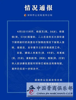 通报称,4月5日11时许,杨某文(男,56岁)、杨某信(男,53岁)报警称,二人在龙华区大浪街道下横朗新村的房屋在不知情的情况下被他人强拆。接报后,龙华警方立即开展调查工作。