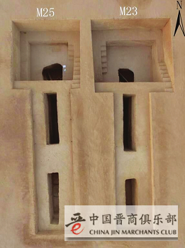 西晋墓葬位于发掘区东北部,23号墓与25号墓东西并列,均为洞室墓。两墓结构一致,皆由斜坡前墓道、过洞、后墓道、甬道、封门、墓室组成。墓道均为两层收台,封门下部用方石和砖,上部用土填充,墓室平面为方形。