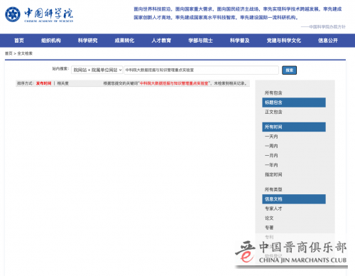 “中科院”是中国科学院的简称,既然“中国科学院大数据挖掘与知识管理重点实验室”挂着“中国科学院”的名头,那么小编就去中国科学院的官网进行了检索,但遗憾的是并没有相关的任何信息。