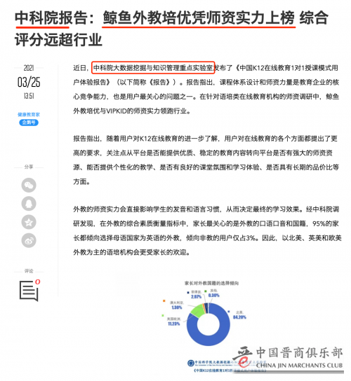 另外,小编还发现,中国科学院大数据挖掘与知识管理重点实验室发布的报告中,在线英语品牌VIPKID在调研中都有不错的表现,比如在另外一部同样是中国科学院大数据挖掘与知识管理重点实验室发布的《2020中国在线教育网课市场白皮书暨2021年前瞻报告》中也是如此,但在由中国科学院计算技术研究所大数据研究院、益普索中国(咨询)有限公司以及南方周末三家机构联合发布的《2021中国K12在线英语发展蓝皮书》中,VIPKID的表现就不再“优秀”了。