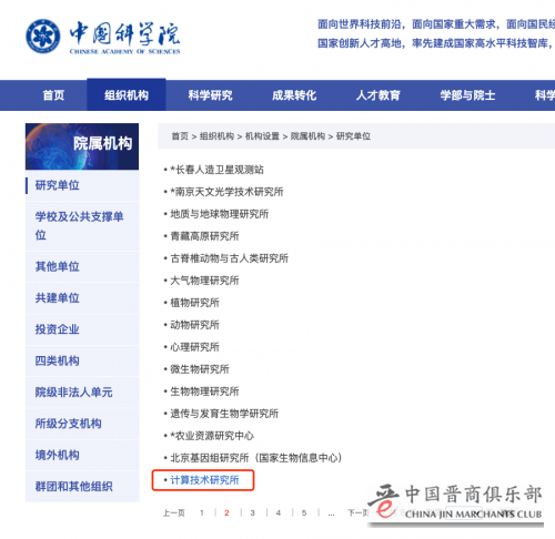 在中国科学院官网的“机构组织”二级页面中,可以看到研究单位名单中有“计算技术研究所”这一单位。