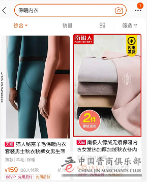 所谓搜索优势,是指在电商平台上搜索“保暖内衣”,前几页布满了南极人的产品和店铺,由此南极人共同体抢占并把守住了流量入口。