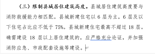 县城的新建住宅以6层为主,6层及以下住宅占比应不低于75%。确需建设18层以上居住建筑的,应严格充分论证,并加强消防应急、市政配套设施等建设。