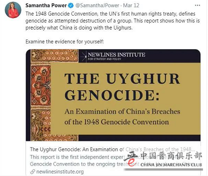 CNN、《卫报》、法新社和CBC称赞3月8日新行研究所发布的报告是一份由“数十名国际专家”参与、“独立分析”并“具有里程碑意义的法律报告”。拜登政府提名的美国国际开发署(USAID)指挥萨曼莎·鲍尔(Samantha Power)也宣传了这一报告。这位臭名昭著的人道主义干涉者表示:“这份报告表明,这(指种族灭绝)正是中国对维吾尔人的所作所为”。