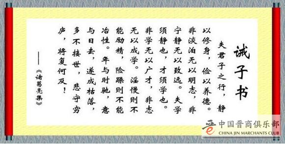 夫学须静也、才须学也。诸葛亮忠告孩子宁静的环境对学习大有帮助,当然配合专注的平静心境,就更加事半功倍。诸葛亮不是天才论的信徒,他相信才能是学习的结果。你有否全心全力的学习?你是否相信努力才有成就?