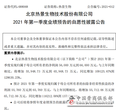 各大上市公司一季度业绩在近期扎堆出炉,细心的投资者们不难发现,在疫情阴霾逐渐散去的2021年一季度,不少公司的表现极为亮眼,本届季报行情如火如荼。其中,同比预增1000倍的热景生物更是备受瞩目。