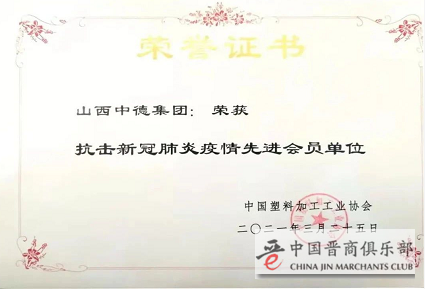 2021年4月12日,在中国塑料加工工业协会召开的七届六次理事(扩大)会议上,宣读的《关于总结表彰抗击新冠肺炎疫情先进会员单位的通知》表彰名单中,中德集团等58家单位荣获“抗击新冠肺炎疫情先进会员单位”荣誉。