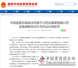 2021年4月15日,市场监管总局根据《反垄断法》第四十六条、四十九条规定作出行政处罚决定,责令扬子江药业集团停止违法行为,并处以其2018年销售额254.67亿元3%的罚款,计7.64亿元。