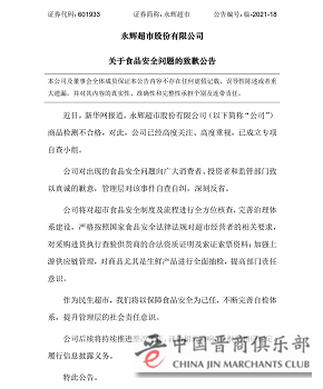 4月16日,永辉超市发布致歉公告称,近日,新华网报道,永辉超市股份有限公司(以下简称“公司”) 商品检测不合格,对此,公司已经高度关注、高度重视,已成立专项自查小组。公司对出现的食品安全问题向广大消费者、投资者和监管部门致以真诚的歉意,管理层对该事件自查自纠,深刻反省。
