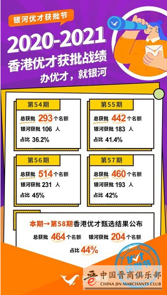 本次获批节的主办单位 -- 银河集团已经成立十四年,是香港身份规划服务行业的龙头企业。在今天出炉的第58期香港优才甄选结果当中,银河集团仍然保持着高达44%的占有率,全球的香港优才总获批名额为464个,有204个名额来源于银河集团,占比达到44%。
