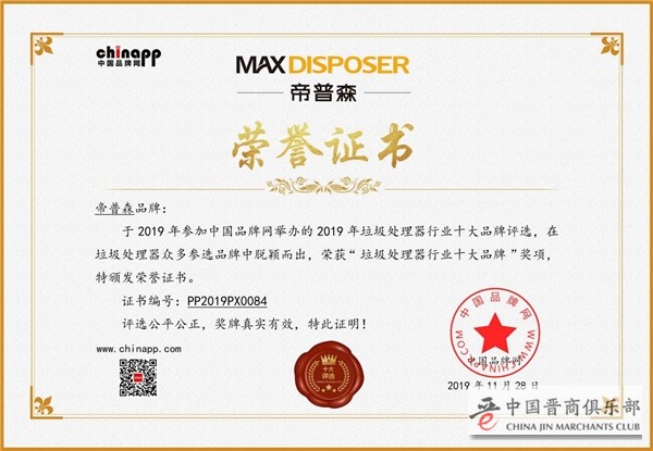 2019年被评为垃圾处理器行业十大品牌,成为“浙江制造”家用厨余垃圾处理器团体标准起草方。生产基地润尚也被评为国家高新技术企业。