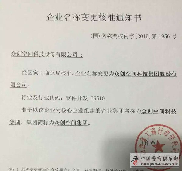 2016年6月6日,众创空间科技股份有限公司通过国家工商总局核准,正式更名为“众创空间科技集团股份有限公司”。