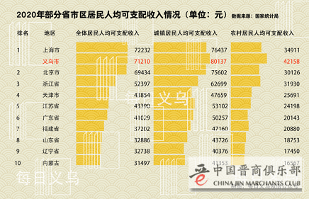 1月27日,国家统计局义乌调查队发布数据:2020年义乌居民人均可支配收入达71210元,全国第二,超越北京、深圳、仅次于上海。