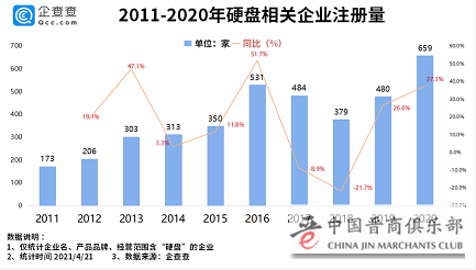 从近十年硬盘相关企业发展状况来看,数据显示,2011-2016年企业注册量呈不断增长趋势,2016年新注册量达到531家。随后两年注册量有所下滑,2018年迎来低谷期,2019、2020年再次上升,其中2020年注册量为659家,同比增长了37.3%,是过去十年注册量最多的一年。