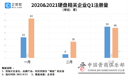 数据显示,2021年第一季度,我国硬盘相关企业注册量为137家,同比增长了53.9%。其中,1-3月份的单月注册量分别为63家、26家和48家。