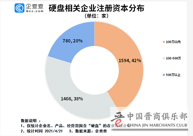 从注册资本分布来看,数据显示,我国硬盘相关企业中有42%的企业注册资本在100万以内,注册资本在100~500万之间的占比38%,注册资本在500万以上的企业占比20%。