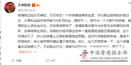 4月27日晚间,坐拥708万微博粉丝的大V“天津股侠”发布博文称:“感谢700万粉丝,十余年的关注,再见了。”