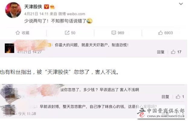 尽管“天津股侠”曾表示,不知哪句话说错了,但有铁粉表示,“你最大的问题,就是天天吓散户,制造恐慌!”