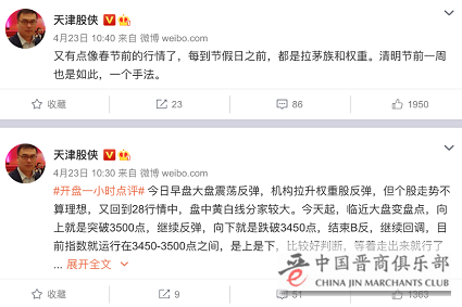 “钢铁板块够猛,又炒顺周期了,就这些题材,每天轮流来。”“又有点像春节前的行情了,每到节假日之前,都是拉茅族和权重。清明节前一周也是如此,一个手法。”这些都是“天津股侠”微博日常对股市的点评。