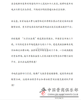 “王金生”4月21日发布微博表示,经自查,目前尚未从事与国家相关法律明令禁止的有关非法证券期货活动,更不涉及非法场外配资网站以及引流非法投资平台;为响应监管部门号召,敬请广大投资者提高警惕,远离非法证券期货活动,远离非法投资平台和非法配资网站避免造成财产损失!