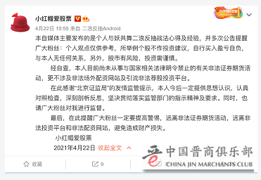 拥有超172万粉丝的“小红帽爱股票”4月22日也及时表态:“感谢‘北京证监局’的友情监管提示,本人今后一定提供(应为提高)思想认识,认真对照检查,深刻剖析反思,坚决贯彻落实监管部门的指示精神及要求。同时,也请广大粉丝对我进行监督。最后,在此提醒广大粉丝一定要提高警惕,远离非法证券期货活动,远离非法投资平台和非法配资网站,避免造成财产损失。”