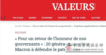 当地时间4月21日,在法国极右翼媒体《现实价值》(Valeurs Actuelles)网站个人专栏中出现了一封联名信。这封信由包括20多名退役将军、100多位高级军官在内的1500余名法国军人共同署名。军人们直接在信中向法国总统马克龙喊话,称法国正在面临几种致命的威胁,虽然他们已为退役之身,但不去关心法国安全这种事情他们“做不到”。