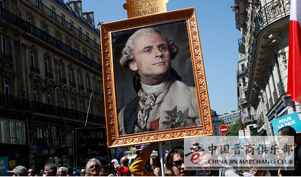 2018年,法国“黄背心”们举着P有马克龙脸的路易十六画像上街 资料图