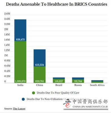 研究显示,印度每年劣质医疗导致的死亡率为1.22‰,远远高于其他金砖国家及其邻国——巴西(0.74‰)、俄罗斯(0.91‰)、中国(0.46‰)、南非(0.93‰)、巴基斯坦(1.19‰)、尼泊尔(0.93‰)、孟加拉国(0.57‰)、斯里兰卡(0.51‰)。
