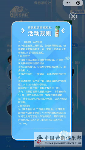 对《青你3》而言,就是通过微信小程序“真果粒青春福粒社”购买“蒙牛真果粒”系列产品,获得“助粒值”后为选手投票。
