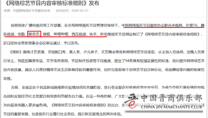 2020年2月21日,中国网络视听节目服务协会发布的《网络综艺节目内容审核标准细则》明确提出了网络综艺节目中不得出现具体内容,共94条。