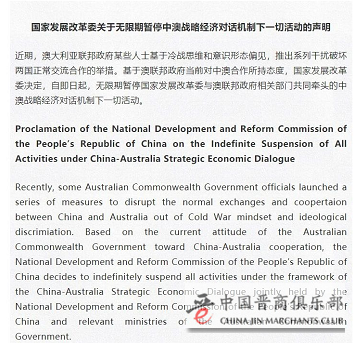 5月6日,国家发展改革委官网发布关于无限期暂停中澳战略经济对话机制下一切活动的声明。