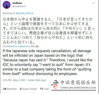 有网友认为,国际奥委会应该主动提出取消,“如果日本自己说取消,那么锅都是日本的。所以我希望国际奥委会主动退出。”
