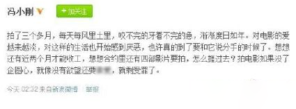 2012年2月8日凌晨,冯小刚在微博上写道,“对电影的爱越来越淡,对这样的生活也开始感到厌恶,也许真的到了要和它说分手的时候了。”