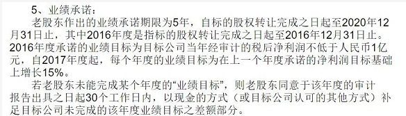 根据协议,双方约定,东阳美拉2016年业绩承诺为净利润不低于1亿元,此后4年间年度增长15%,未实现目标的差额部分,由冯小刚以现金的方式补足。
