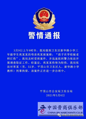 河南平顶山市卫东公安分局5月7日发布警情通报称,3月9日上午9时许,我局接到卫东区新华路小学三年级学生苑某某的母亲苑某报案称:“孩子在学校被老师打伤”。我局及时受理案件,并迅速组织警力依法开展调查取证工作。