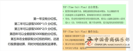 TUP—时间单位计划,即预先授予一个获取收益的权利,包括分红权和增值权,但收益需要在未来N年中逐步兑现,同样,其与所有权性质的股权没有关系,TUP的权利兑现后自动销毁,以五年一个周期。具体如下图: