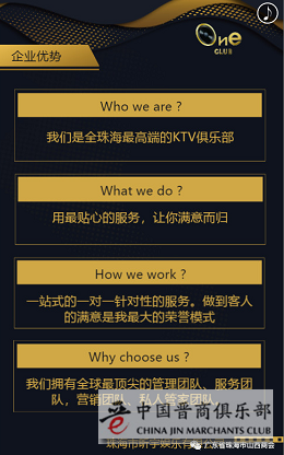 ONE CLUB将致力于高端订制型KTV的领先者,积极打造和完善产业链,努力把ONE CLUB打造成中国高端订制性KTV服务行业的领军品牌。我们不断追求卓越,人才团队的高精尖,发展思维的再拓宽,致力于整合行业资源,创新KTV商业模式,颠覆传统的商经验管理方式,走出一条独属ONE CLUB的订制化模式。