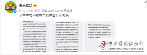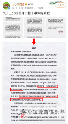 5月10日,三只松鼠就“开口松子”事件在其官方微博发布了致歉声明。声明中称,该事件已于2021年3月查明原因并完成整改,并成立了专项整改小组,对所有产品从生产到流通进行全面排查。