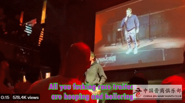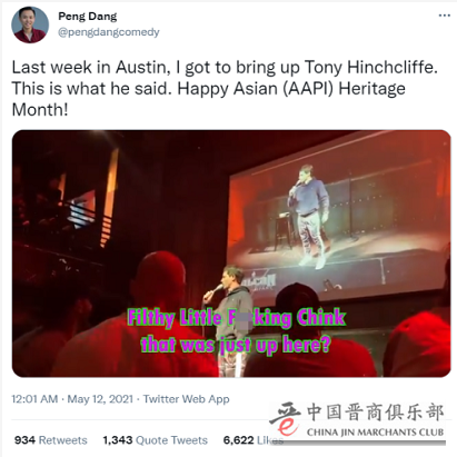 当地时间5月6日,美国得州奥斯汀一场喜剧秀上,美国喜剧演员、编剧托尼·辛奇克里夫(Tony Hinchcliffe)被中国籍喜剧演员鹏(Peng Dang)介绍上场后,连蹦辱华词汇,不仅称呼鹏为“filthy little f**King chink”(肮脏的中国佬),还吹嘘自己以往的辱华表演经历。