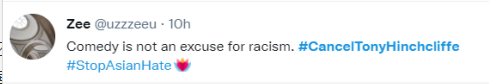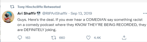 辛奇克里夫还转发了美国喜剧人Ari Shaffir的推特:“伙计们,事情是这样。如果你听到一个喜剧演员在节目里说一些种族主义的笑话,他们知道自己被录着,那他们肯定是在开玩笑。”